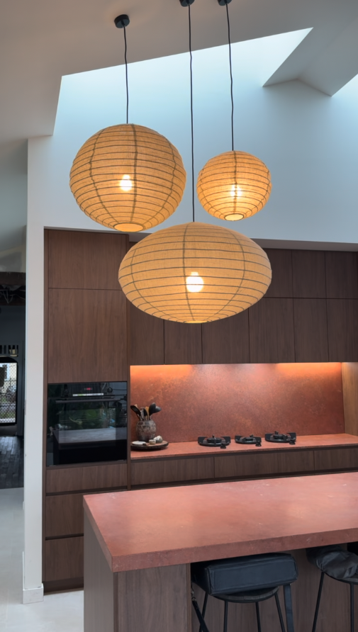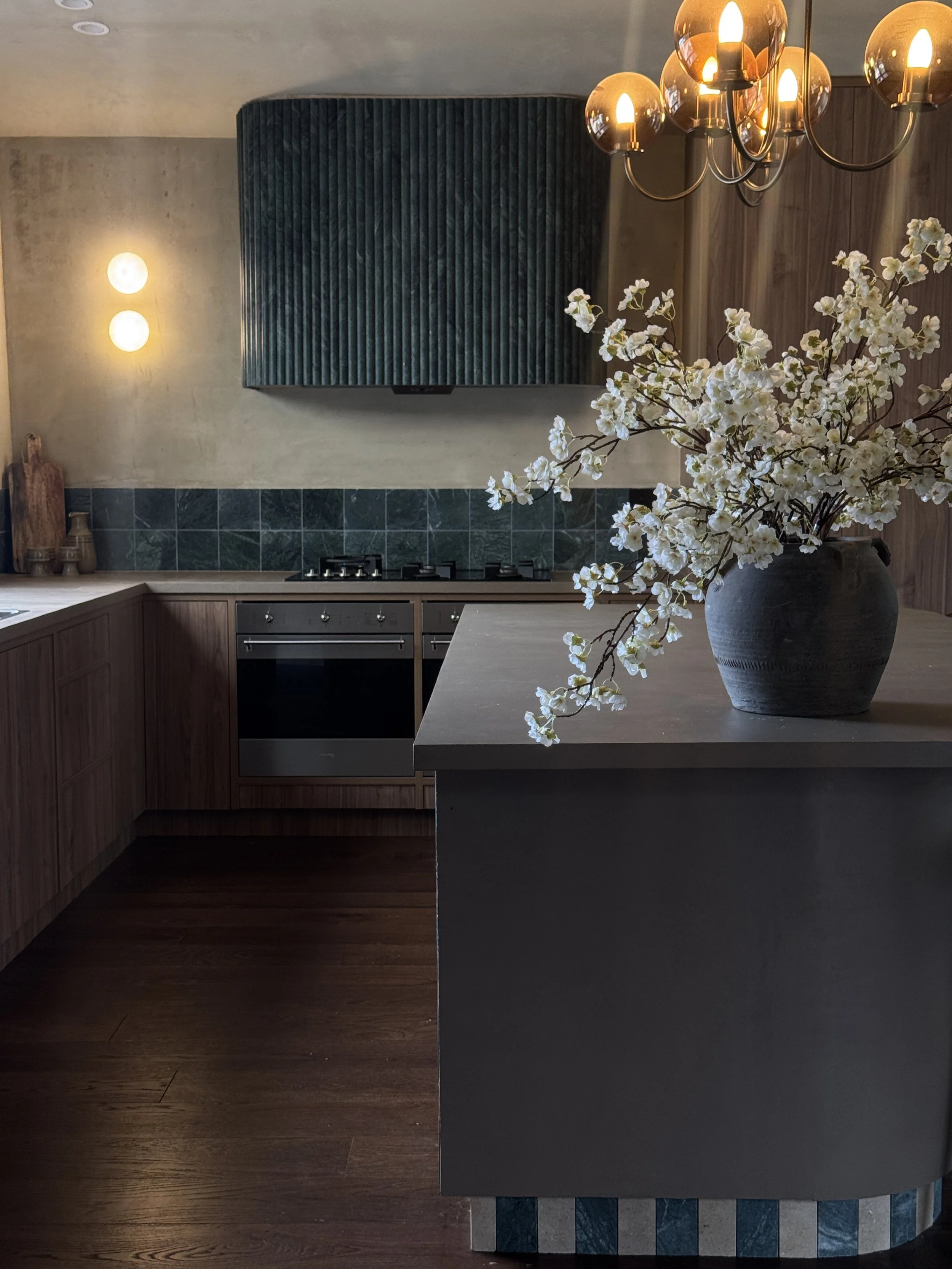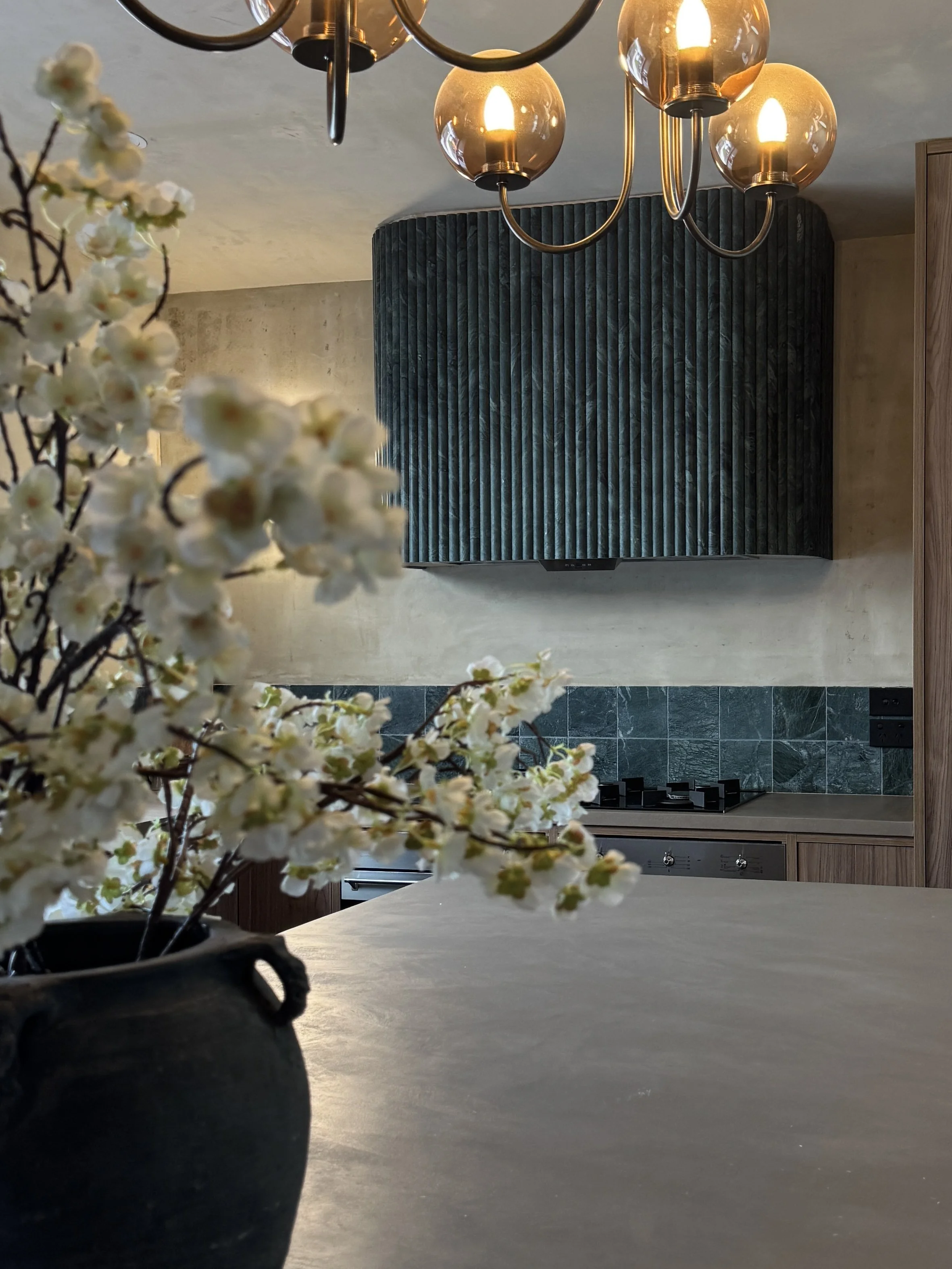 We opened up the layout to create seamless flow from the hallway into a newly designed dining zone and warm, inviting lounge space. The kitchen was fully reimagined with moody textures, bold tiling, and layered finishes — including a standout curved rangehood and feature pendant lighting above a stone island.