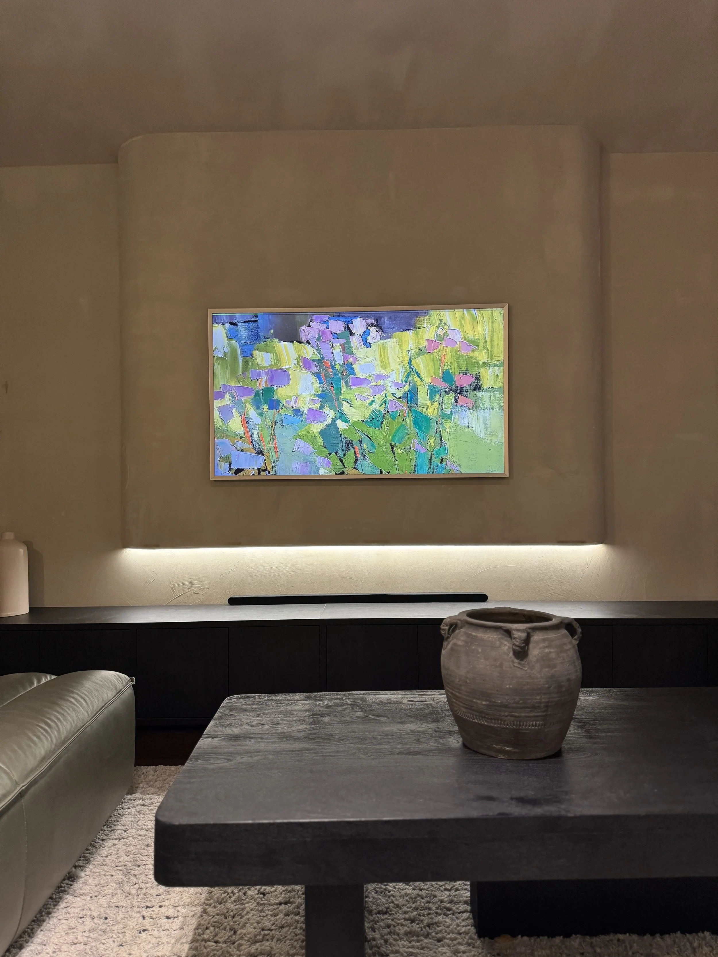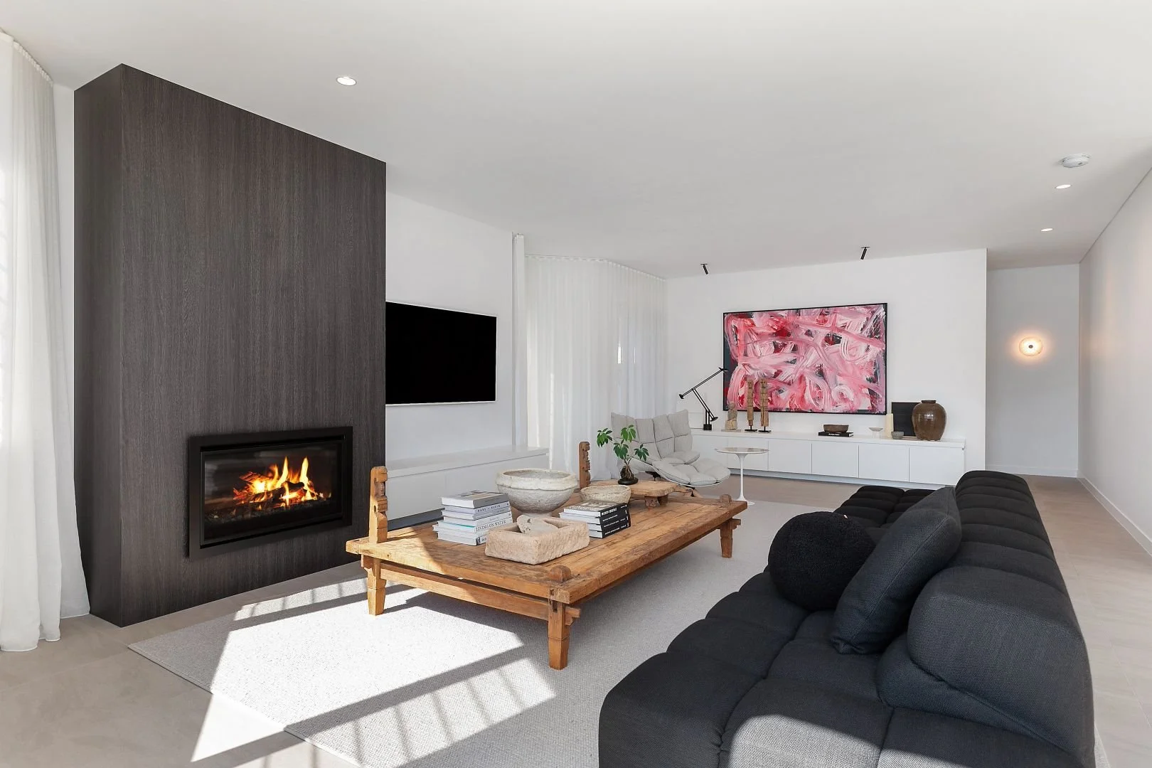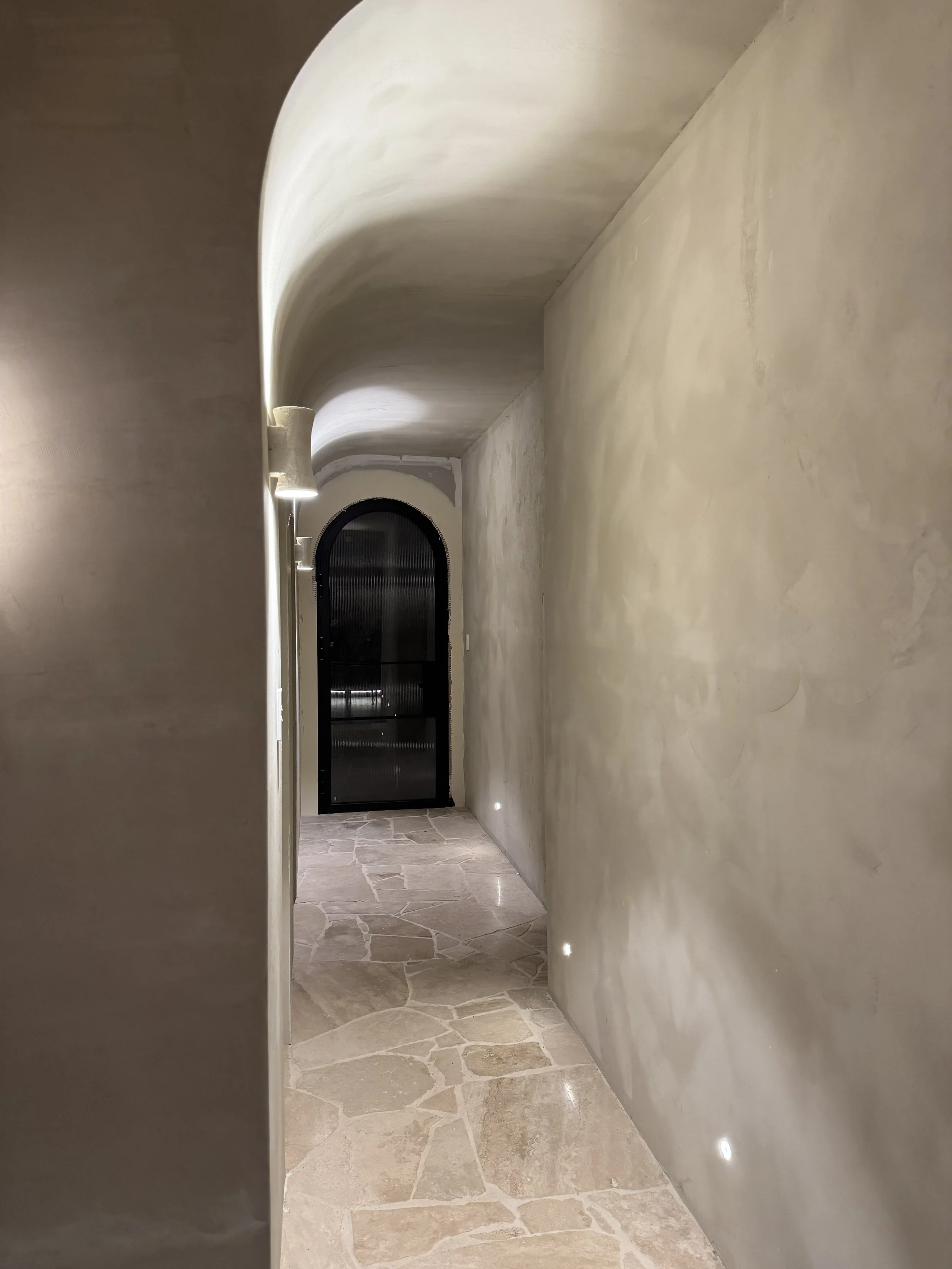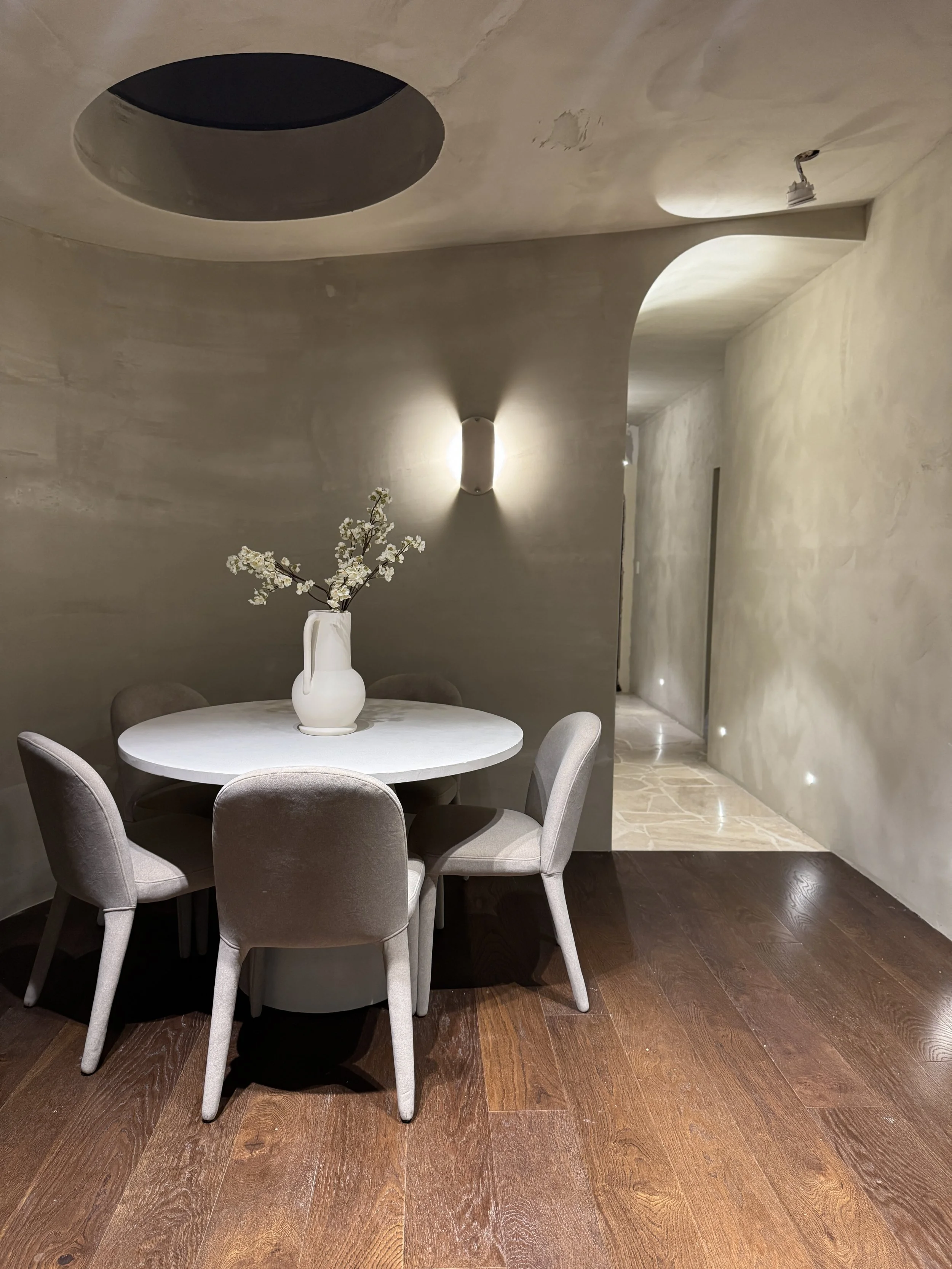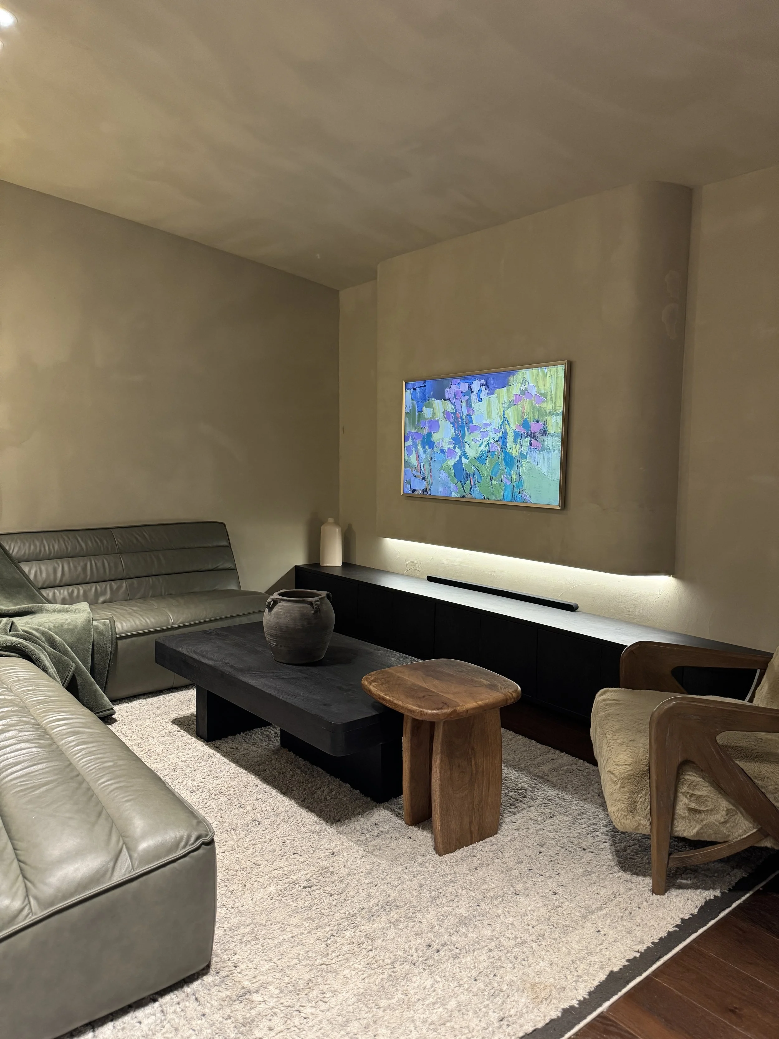 Down the hall, micro-cement walls and curved corners bring softness and continuity, while integrated lighting highlights every line and finish. The lounge was fitted with custom cabinetry, built-in lighting, and a mix of timber and stone textures to give the space warmth without losing its clean, modern edge.